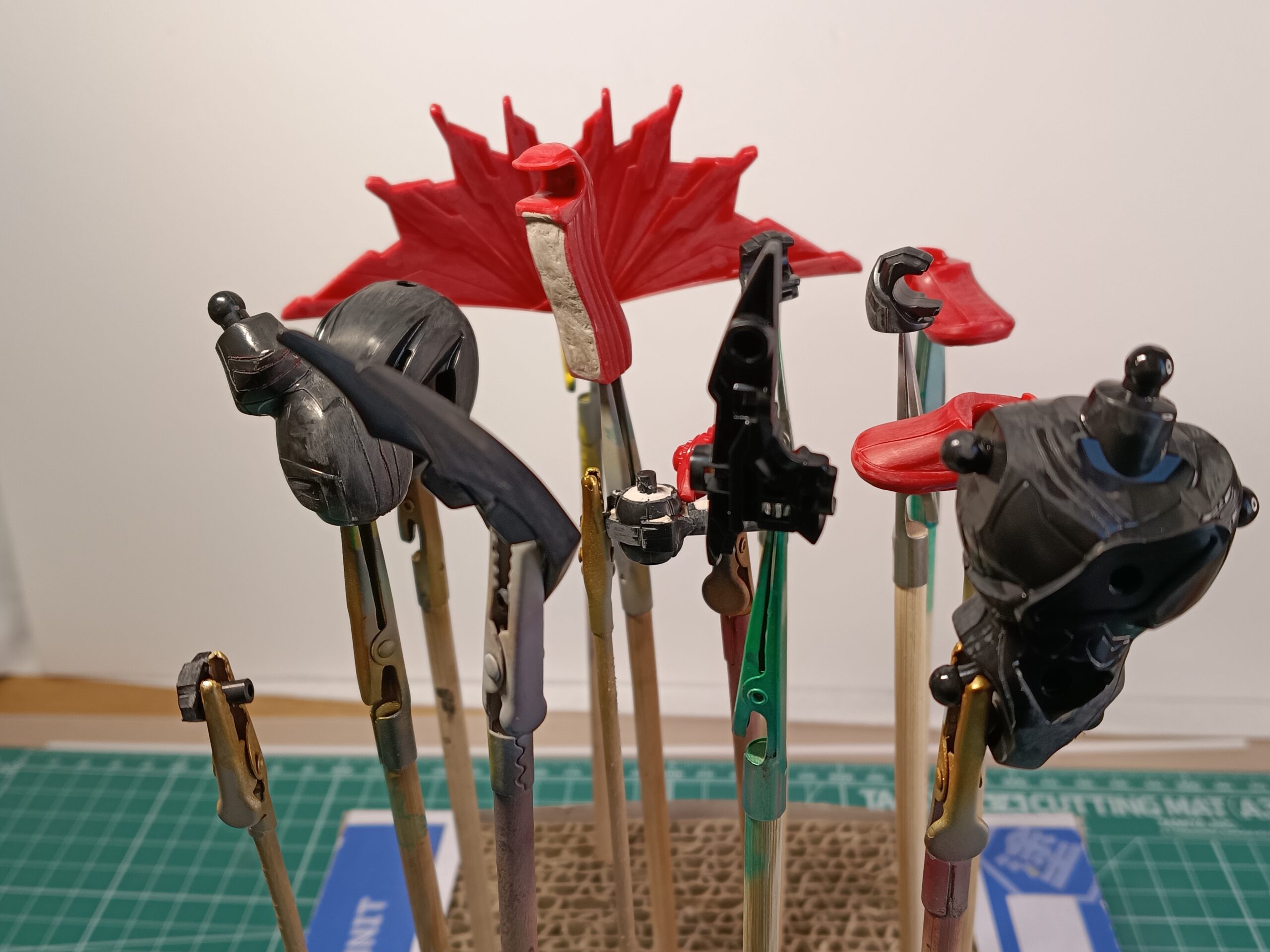 [仮面ライダーゼッツ フィジカムインパクト] この時期にしては、パーツの乾燥に時間が掛かりませんでした!! プラモ制作 X Facebook はてブ Pocket LINE Pinterest 2026.01.112026.01.17 どうも、ヨシです。 朝からの強風で、外に出しておいたパーツが良く乾燥されてました!! これまでの作業工程は。。。 乾いたパーツに手持ちを付けて、サーフェイサーを吹き付ける準備完了!! クイックビルダーズは基本的に、遊べるプラモデルなので一つ一つのパーツが大きいです!! パテ盛りした箇所とスジボリした所の表面をサフ吹きで入念にチェックします。 では、この続きはまた今度。。